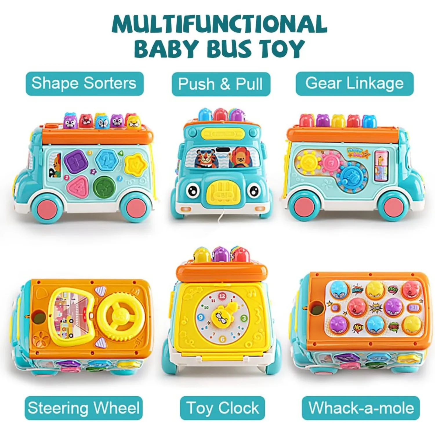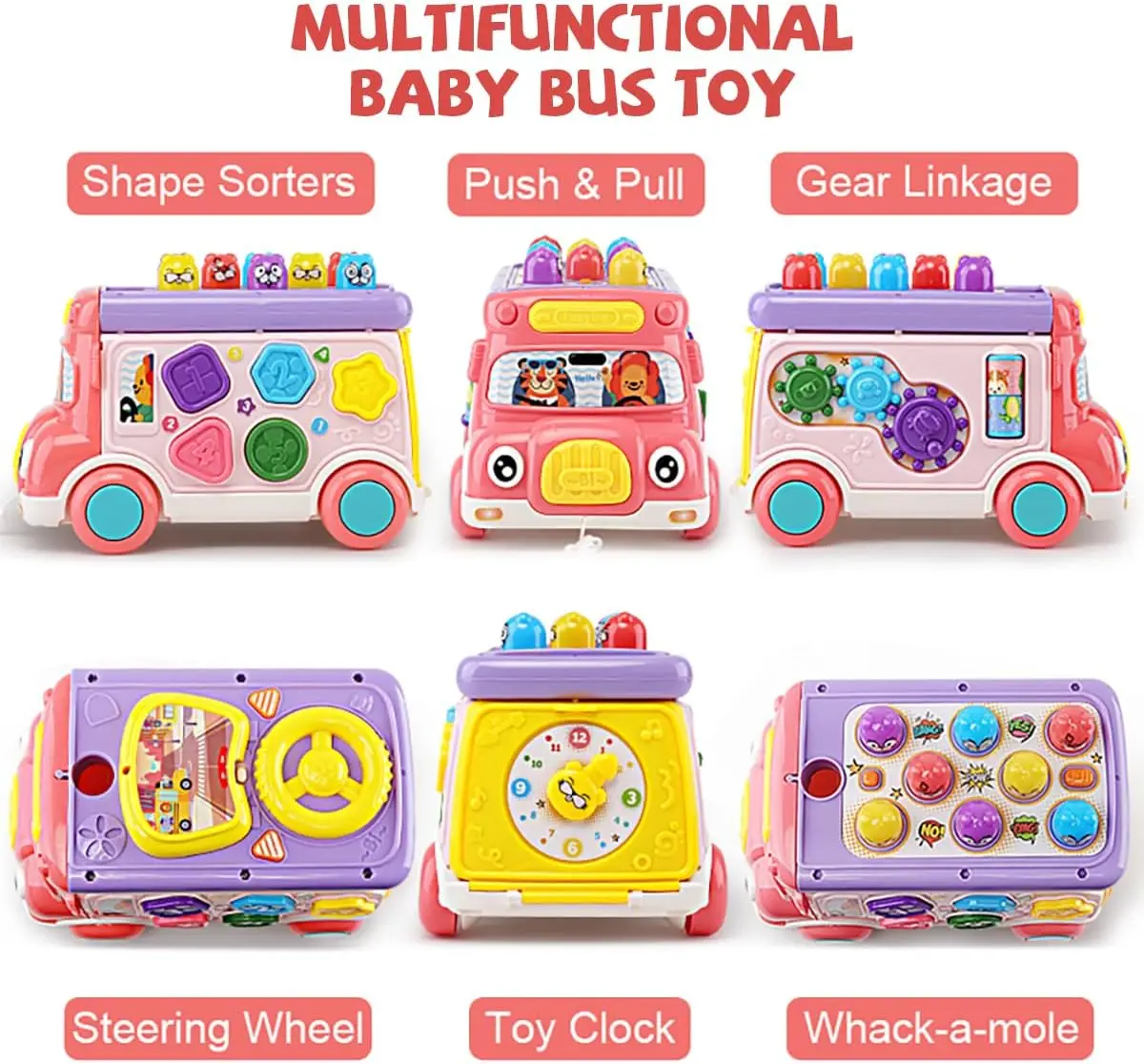 ACTIVITY TOY CAR : The cute cartoon pull toy bus, each side have activity center, including whack-a-mole game, shape matching, gear linkage, car steering wheel, animal pairing, toy clock. The pounding bench need powered by 3 x AAA bateries( not including).