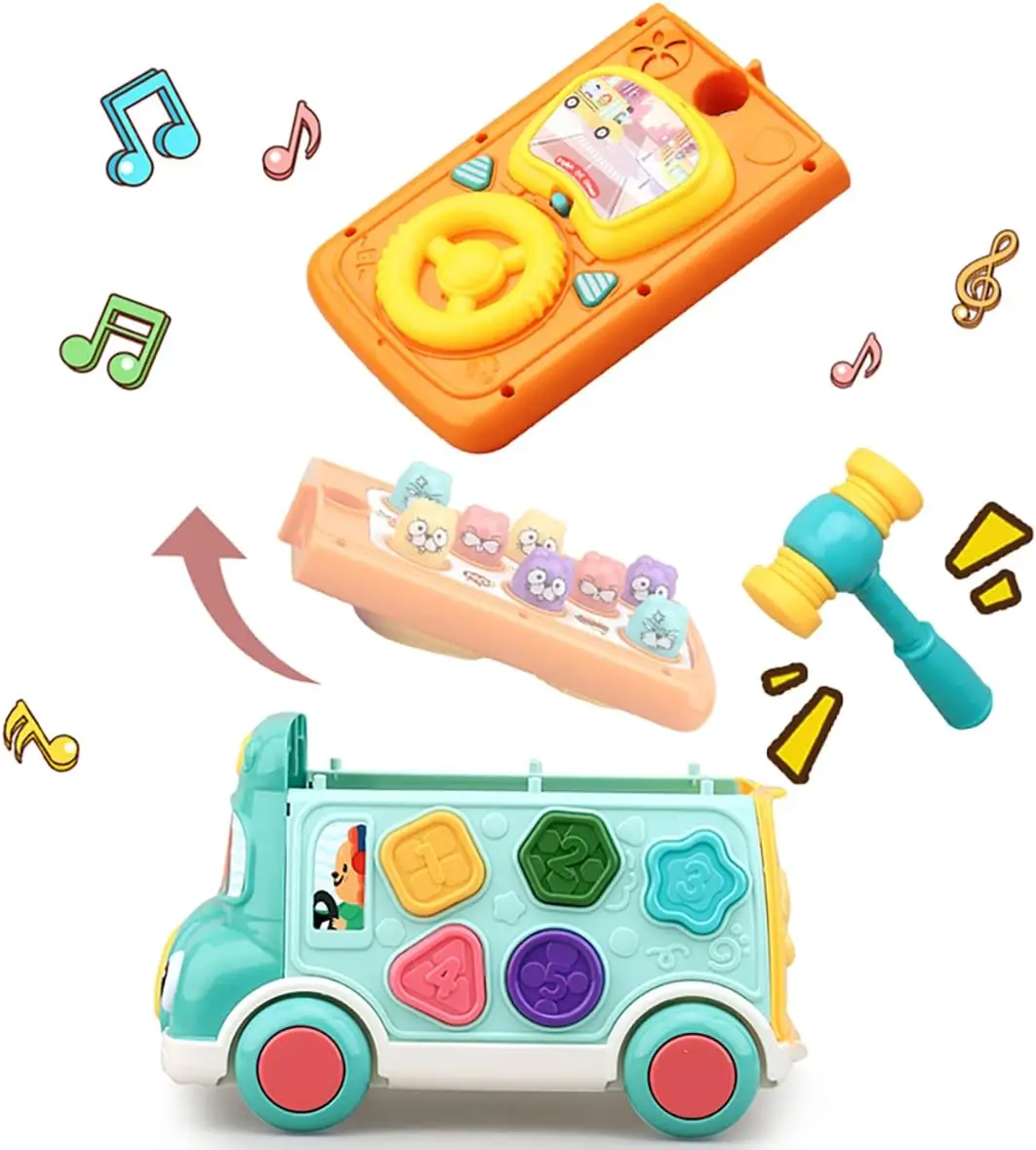 Music Activity Bus Baby Toy with Sound & Light Shape Sorter Whack-a-Mole Toys Interactive Game Cartoon School Bus for Kids